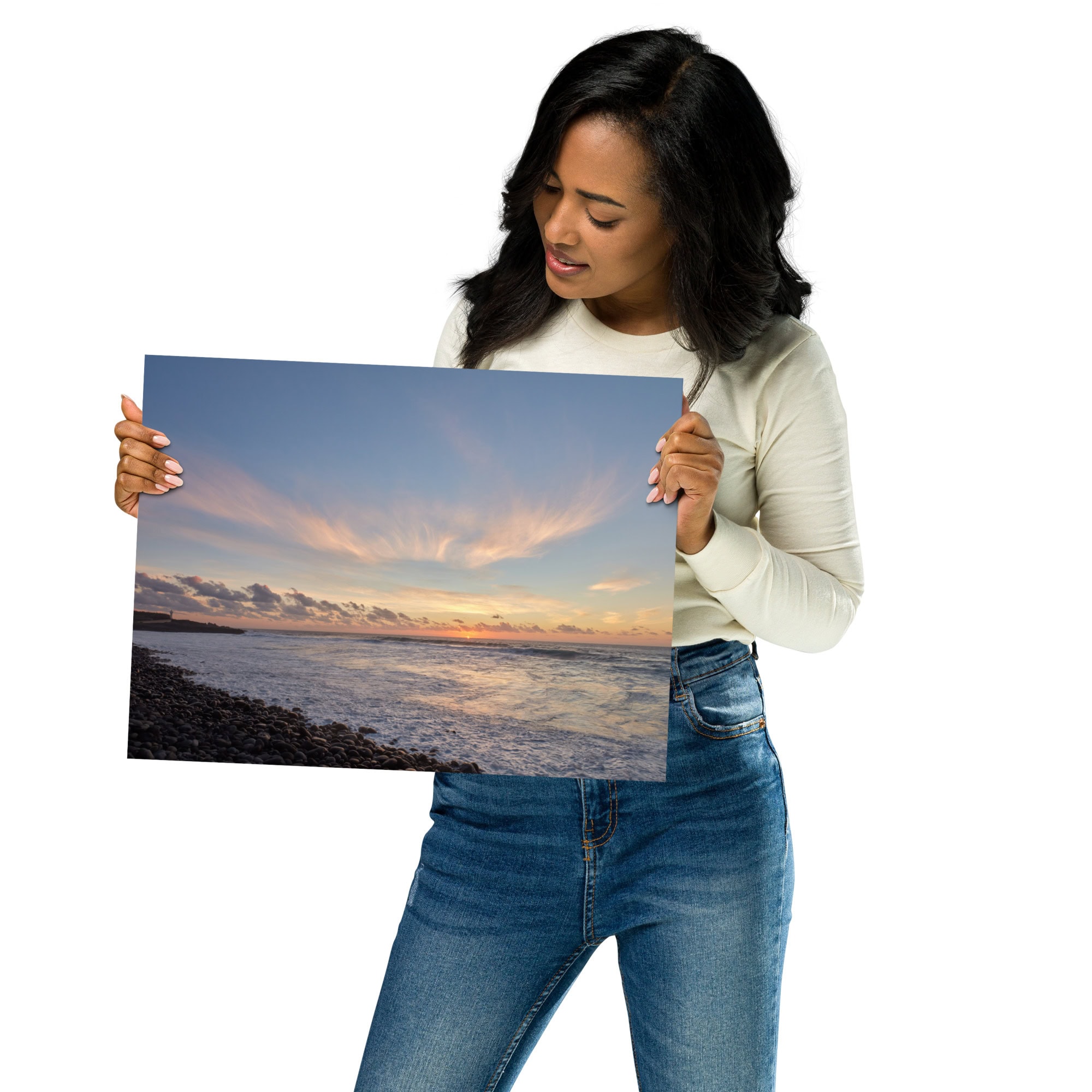 El Póster Atardecer en Los Guirres presenta una fotografía que captura un atardecer sobre la desaparecida playa de Los Guirres, en La Palma, antes de la erupción volcánica de 2021. La imagen muestra el sol poniéndose sobre el horizonte, iluminando el cielo y la superficie del agua en la playa. Este póster está impreso en alta resolución sobre materiales duraderos, y está disponible en varios tamaños.
